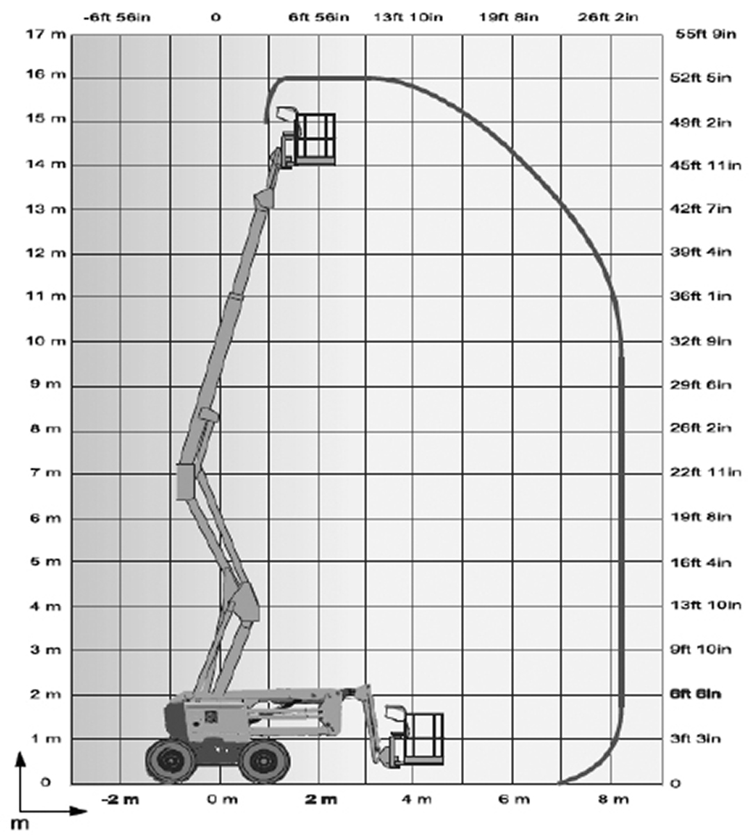Arbeitshöhe 16.00 Plattformhöhe 14.00 Plattformgröße 1,83 x 0,8 x 1,1 m Bühnentragkraft 230 kg Drehbereich 355° Seitliche Reichweite 8,30 m Durchfahrthöhe 2,30 m Fahrzeugbreite 2,30 m Fahrzeuglänge 6,75 m Eigengewicht 6450 kg Antrieb 4x4-Allrad Sonstiges max. Steigfähigkeit 40 %; Knickpunkthöhe 7,65 m; Pendelachse vorne, Schrägstand bis 5° Führerscheinklasse kein Führerschein erforderlich -