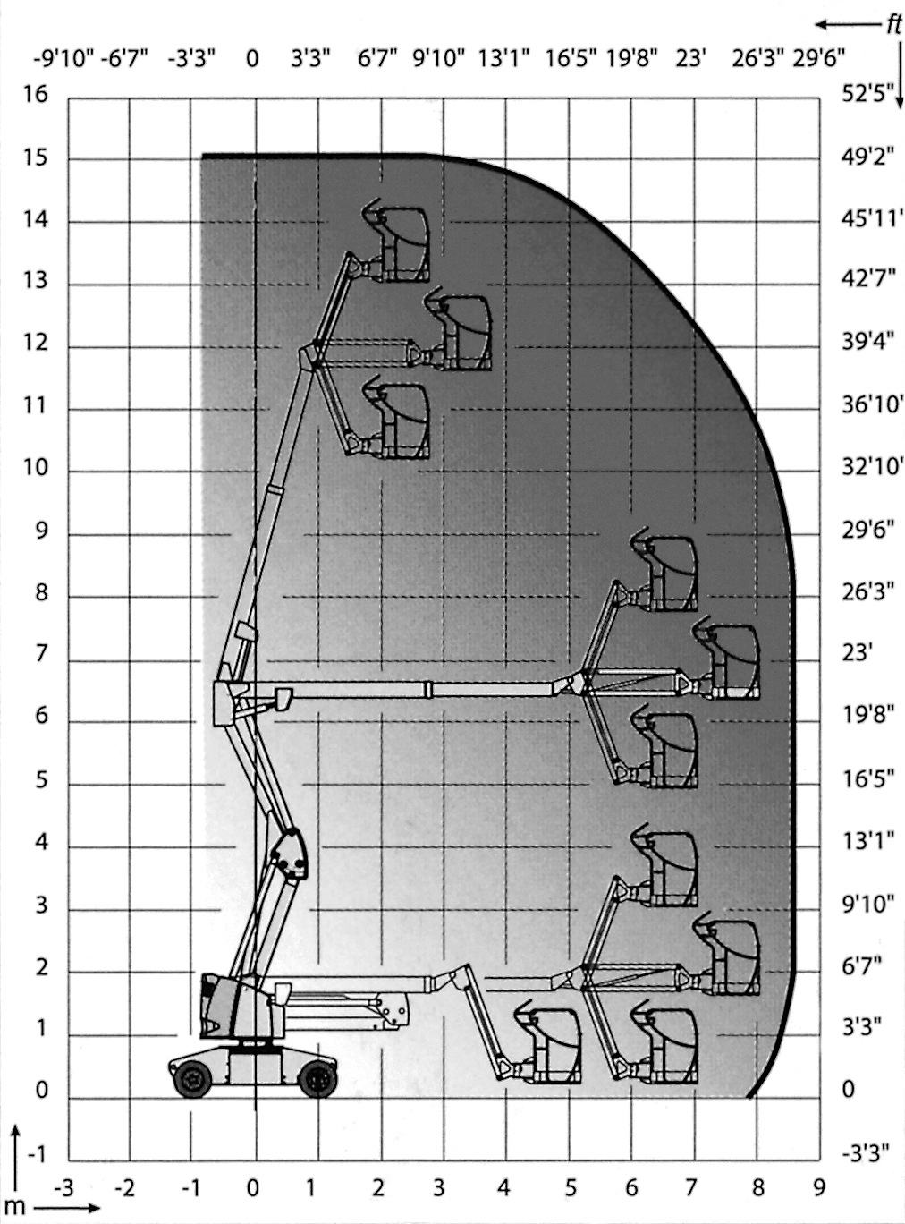 Arbeitshöhe 15.00 Plattformhöhe 13.00 Plattformgröße 1,2 x 0,8 x 1,1 m Bühnentragkraft 230 kg Drehbereich 360° Seitliche Reichweite 8,50 m Durchfahrthöhe 2,00 m Fahrzeugbreite 1,50 m Fahrzeuglänge 5,50 m Eigengewicht 7300 kg Antrieb elektrisch / Batterie Sonstiges ausgezeichnete Manövrierfähigkeit durch Wende- kreis von nur 3,70 m und einer Breite von 1,50 m, nicht markierende Bereifung Führerscheinklasse kein Führerschein erforderlich -