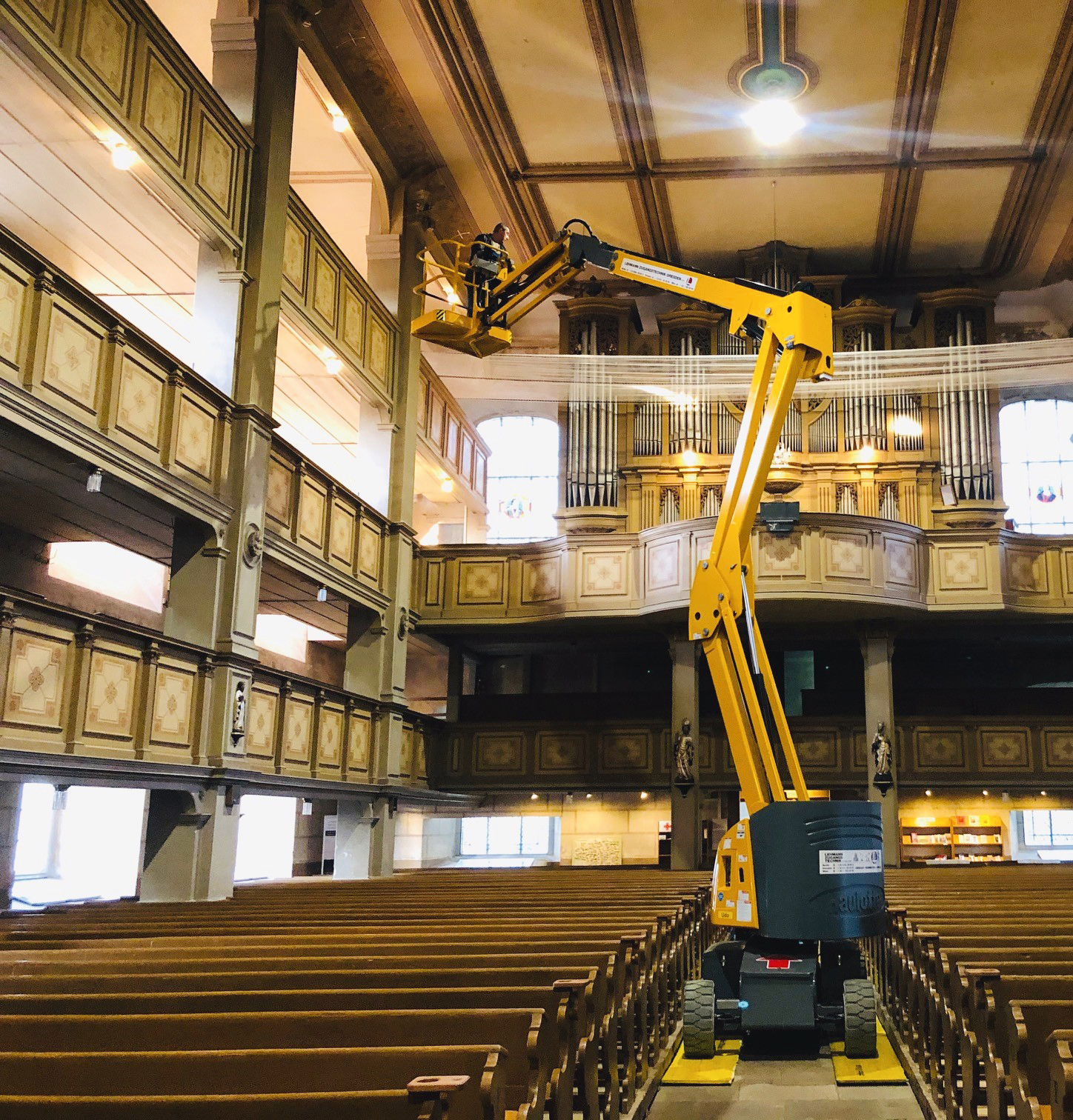 Emissionsfreie Gelenkbühne mit 15 m Arbeitshöhe für präzise Einsätze in Innen- und Außenbereichen.