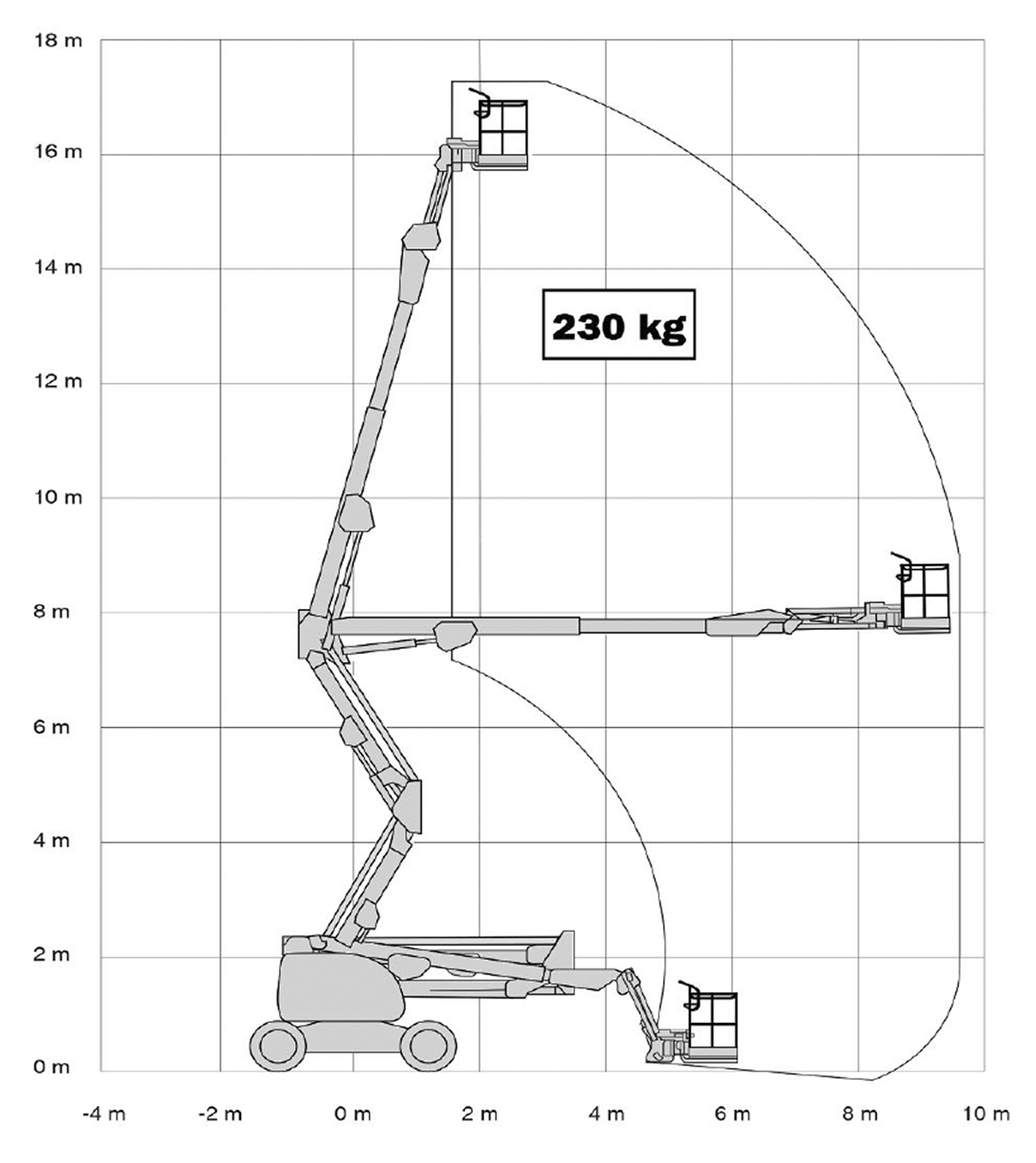Arbeitshöhe 17.80 Plattformhöhe 15.80 Plattformgröße 1,83 x 0,76 x 1,1 m Bühnentragkraft 230 kg Drehbereich 360° Korb schwenkbar 2 x 90° Seitliche Reichweite 9,48 m Durchfahrthöhe 2,29 m Fahrzeugbreite 2,34 m Fahrzeuglänge 7,68 m Eigengewicht 7650 kg Antrieb 4x4-Allrad Sonstiges max. Steigfähigkeit 45 %; Knickpunkthöhe 7,67 m; Pendelachse, kein Drehwagenüberhang Führerscheinklasse kein Führerschein erforderlich -