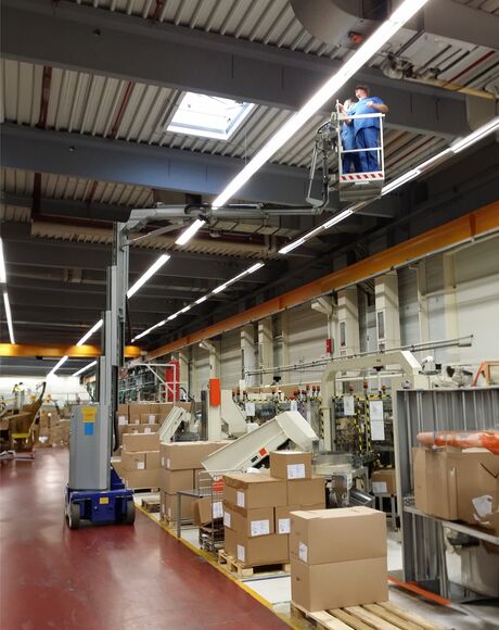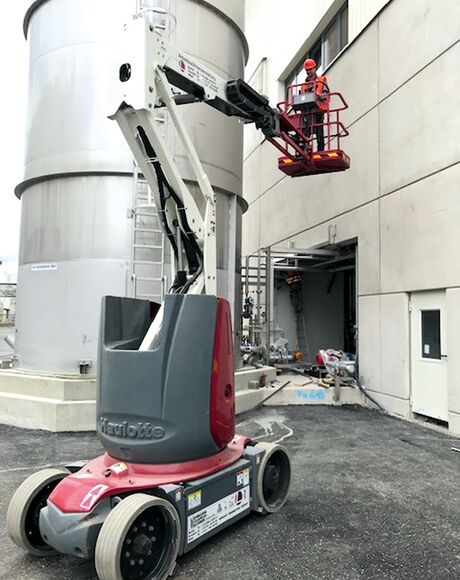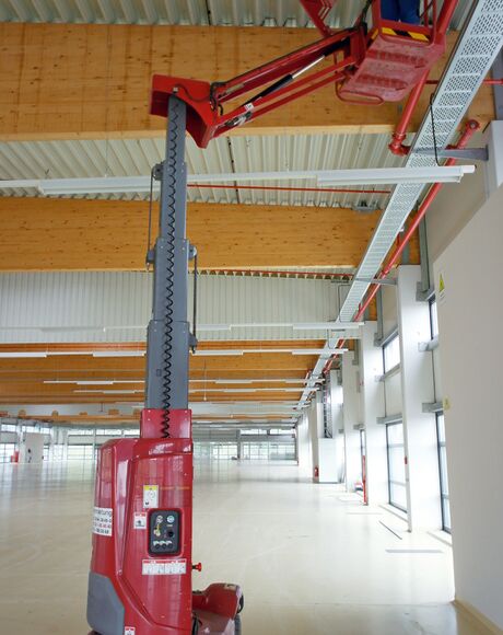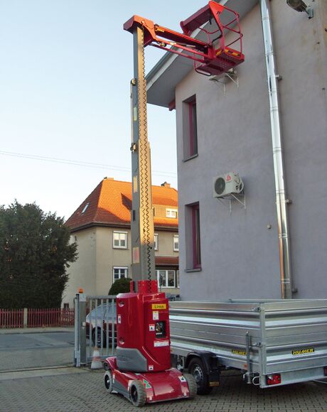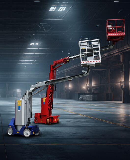 Kompakte Mastbühne mit 10 m Arbeitshöhe für enge Innenbereiche und präzise Manöver.